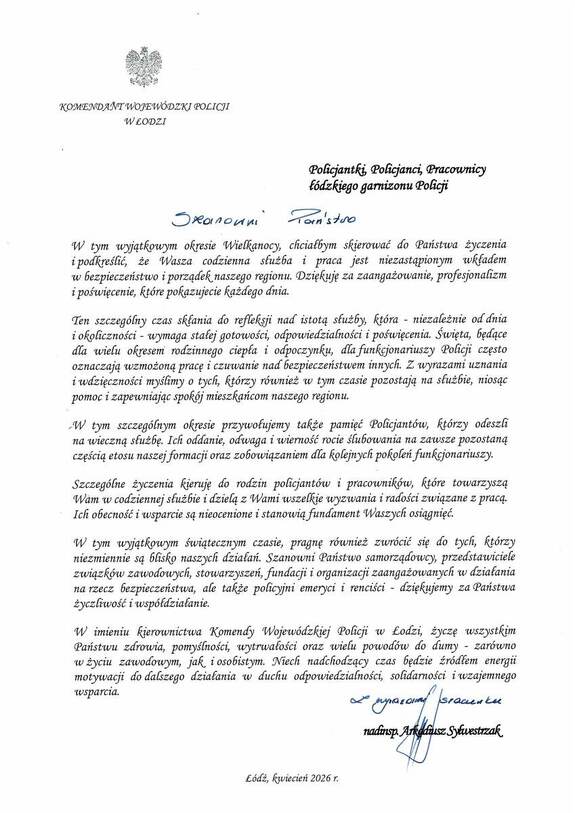 Życzenia świąteczne Komendanta Wojewódzkiego Policji w Łodzi nadinspektora Arkadiusza Sylwestrzaka Dodano: 06.04.2026