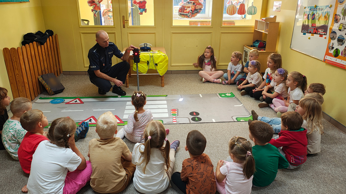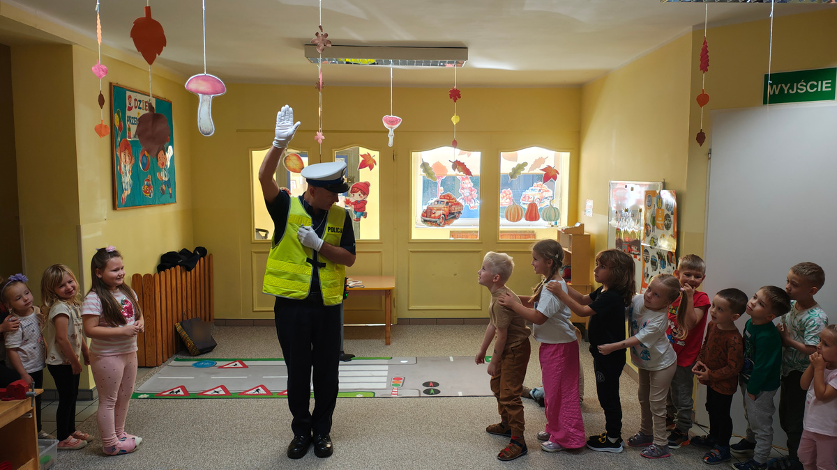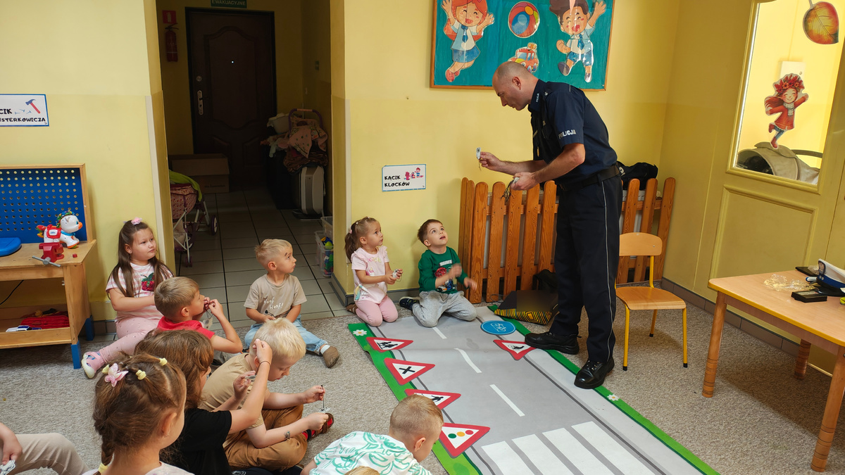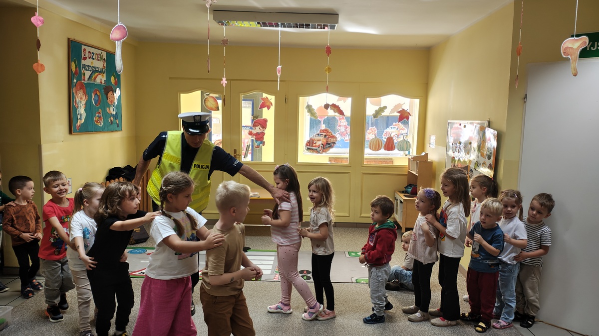 W minionym tygodniu funkcjonariusz Komendy Powiatowej Policji w Wieruszowie spotkał się z najmłodszymi w przedszkolu „Zielony Listek, aby porozmawiać z nimi o podstawowych zasadach bezpieczeństwa. Podczas zajęć dzieci dowiedziały się, jak prawidłowo poruszać się po drogach i w jaki sposób bezpiecznie przechodzić przez jezdnię. Policjant przypomniał zasady związane ze znajomością sygnalizacji świetlnej oraz wyjaśnił, po której stronie drogi piesi powinni się poruszać. W praktyczny sposób pokazał także, jak prawidłowo zachowywać się w takich sytuacjach. Funkcjonariusz zachęcał również najmłodszych do korzystania z elementów odblaskowych, które znacząco poprawiają bezpieczeństwo na drodze. Dużą atrakcją dla przedszkolaków był pokaz kierowania ruchem drogowym, dzieci mogły zobaczyć, jak policjant wydaje sygnały i reguluje ruch pojazdów. Nie zabrakło także dodatkowej atrakcji, każde dziecko miało okazję odbić swoje linie papilarne na specjalnie przygotowanych formularzach. To ćwiczenie wzbudziło wiele ciekawości i radości wśród najmłodszych. Na zakończenie spotkania wszystkie dzieci otrzymały odblaskowe gadżety ufundowane przez Starostwo Powiatowe w Wieruszowie. Był to praktyczny prezent, który pomoże zwiększyć ich widoczność i bezpieczeństwo.